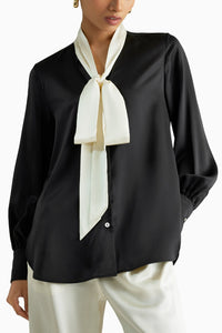 Long-sleeved tie-neck top in black and cream, crafted in 100% silk charmeuse satin with mother of pearl buttons. Designed with a long neck tie to be fastened as desired and gathers at the cuff.