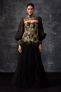 This elegant black gown features a dramatic cut-out neckline, sheer puff sleeves, and intricate gold floral embroidery that cascades into a flowing tulle skirt—perfect for statement-making evenings.