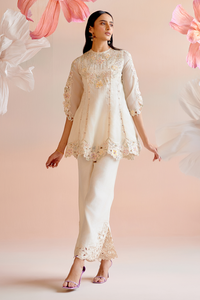 This enchanting ensemble features an Ivory silk organza flared short kurta embellished with exquisite cutwork and beadwork, creating a delicate and sophisticated look. Paired with ivory Chanderi floral cutwork bell bottom pants, which showcase stylish slit details, this outfit beautifully combines modern flair with timeless elegance. Perfect for festive occasions or chic gatherings, it's sure to turn heads!