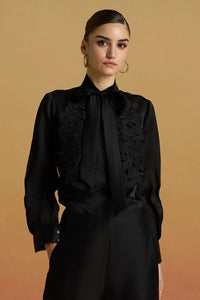 Featuring Black Cutwork Bib Layered Shirt by Chandrima’s Amaryllis FW25 Collection. A sophisticated black silk organza layered shirt with cutwork bib detailing and tie-up accents, offering a contemporary, textured silhouette that combines artisanal craftsmanship with modern elegance.