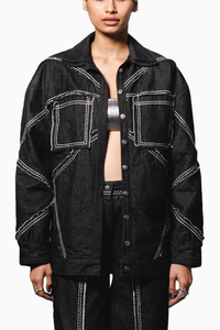 Featuring Black Denim Jacket by Mellow Drama from their A/W'24 Collection - Catalyst. Elevate your denim style with this oversized quilted jacket. Crafted from 100% Cotton denim, it boasts a double collar detail, front pockets, and front openings with statement logo buttons. Redefine casual chic with this bold and stylish piece.