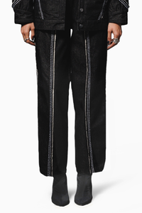 Featuring Black Denim Pants by Mellow Drama from their A/W'24 Collection - Catalyst. Elevate your denim game with these wide-leg, mid-waist pants. Crafted from 100% Cotton denim, they feature utility pockets, dart details, a front opening with zipper and statement logo button, and contrast stitch embroidery with raw edge detail. Redefine casual chic with this versatile and stylish piece.