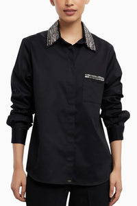 Relaxed fit shirt offers features a classic collar with a sophisticated concealed placket adorned with sleek metal buttons. Designed with full-length sleeves for a timeless, versatile look. The standout detail: an exquisitely embellished collar and pocket, adorned with 530 black diamond Swarovski stones, adding a touch of luxurious sparkle.