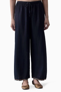 Dikyi pyjama in black lightweight Mushroo, featuring intricate dabka, nakshi, and glass beadwork at the hem. A flexible waistband ensures comfort while the embellishment introduces a rich, textural finish.