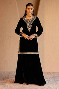 The Black Dori Velvet Kurta with Sharara Pants is a stunning blend of luxury and tradition, perfect for making a statement at weddings, festivals, or grand celebrations. Crafted from rich velvet, the kurta features a deep black hue that exudes sophistication, with meticulously crafted dori embroidery on the neckline, sleeves, and bodice adding intricate detail. Paired with flowing sharara pants in complementary fabric, the ensemble creates a dramatic, graceful silhouette.