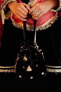 Featuring the Black Dori Potli Bag, this velvet accessory effortlessly adds elegance to your festive outfits. The delicate floral embroidery and gota embellishments enhance your look with a sophisticated touch. The lightweight handle, crafted with gota detailing, beautifully complements the design, while velvet gota-embellished tassels bring extra charm.