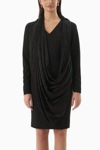 Featuring the Black Drape Dress by Renasci from the Untamed Collection. Crafted in Roma with Sandwash Satin, this fitted masterpiece in classic black embodies sophistication with a touch of allure.