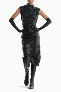 Our black midi dress is made using a lustrous lamè fabric and features soft drapes all over. Pair it with an oversized clutch and statement earrings for maximum impact.