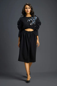Featuring puffed sleeves and a bold front midriff cut-out, this black dress is accented with delicate blue floral embroidery on the shoulder, creating a striking balance of edgy and elegant.