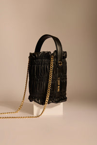 A bold reimagination of a classic silhouette, the Drift bucket bag in inky black is made for the after-hours. Smocked luxe lamé, gold-toned accents, and a suede-lined interior define its rich, tactile appeal. With a removable handle, it adapts to any occasion with ease. Dark and dramatic, it’s not just an accessory—it’s an entrance.