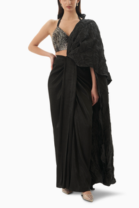 Fabric: Metallic Brallete With Sandwash Satin With Crushed Silk Color: Black Fit: Fitted Components: 2 (Bralette And Saree Drape) Product Code: SVERENARJSV20