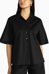 Featuring the Black Egyptian Cotton Bowling Shirt by Refined Revolution. Crafted from 100% Egyptian Giza Cotton with a luxurious 120/2 thread count, adorned with mother of pearl buttons. Its A-line fit with back yoke gathers ensures a relaxed yet sophisticated look, true to size.
