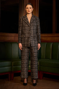 Featuring Ella Co-ord by San Seh, this modern pant suit is crafted in a textured metallic weave, delivering a sleek, statement-making silhouette with contemporary edge.