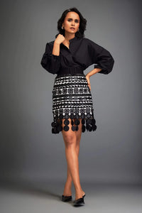 Featuring geometric embellished skirt with a voluminous sleeve blouse.
