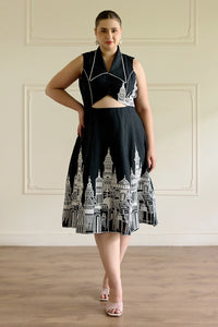 This black A-line dress features intricate building structure embroidery all over, with a swallow collar accented by contrast lace. Detailed embroidery on one side of the yoke and piping along the princess seams add sophistication. Finished with show buttons and a stylish center cut.