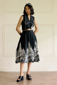 This black co-ord set features an A-line midi skirt embroidered with intricate building structures. Paired with a swallow-tailed collar crop top detailed with contrast lace, side zip, and show buttons. Embroidery and piping on one side of the princess cut add a refined architectural touch.
