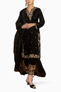 The neck and sleeves of the tunic has detailed embroidery and the back has slight hand embroidery all over. Matching straight mid-waist pants with hand embroidered organza panel and fully-elasticated waist. The organza dupatta has big motif and detailing all over.