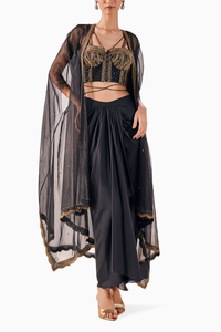 Featuring Black Enchanting Draped Skirt with Blouse with Embroidered Corset by Mandira Wirk. Embrace sophistication with our stunning ensemble, featuring a draped skirt paired effortlessly with an embroidered corset blouse. Complete the look with a chic cape and a trendy belt for added flair, perfect for making a statement at any special occasion.
