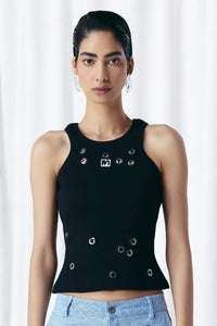 This ribbed tank features intricate eyelet details and a bold statement logo, combining effortless style with everyday comfort.