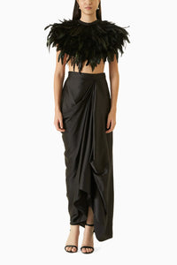 Every bit luxe and fabulous, this black feather cape set encapsulates the energy of a dreamy fit and will surely turn heads.
