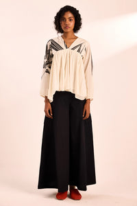 A white, flowy top with soft gathers and delicate ladder lace detailing. The abstract print above the bust and full sleeves make it perfect for both casual and statement looks.