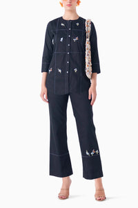 Featuring a luxurious cotton satin Fernoa black embroidered co-ord set. This elegant ensemble showcases intricate floral hand embroidery on the front, complemented by a regular-fit shirt with block panel bidding details and tonal buttons. The matching pants include embroidery on the left side, highlighted with orange bidding, plus a comfortable back elasticated waist, side zipper, and functional side pockets. Perfectly tailored for both ease and sophistication.