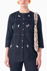 Featuring a Cotton Satin Fernoa black embroidered shirt in a regular fit. Highlighted by intricate floral hand embroidery on the front, it’s finished with block panel bidding details and tonal buttons, blending timeless elegance with modern craftsmanship.