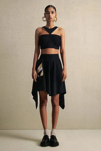 Elevate your style with this luxurious co-ord set, featuring a chic V-cut bustier adorned with hand-pelleted detailing. The impeccably tailored bottoms come with a hidden side pocket, enhanced by intricate threadwork. Effortlessly elegant and undeniably premium.