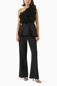 Featuring Black Fleur Coord Set, Made from crepe, Brallete Top is one shoulder and in peplum style. Paired with Mide rise pants that offers relaxed fit.