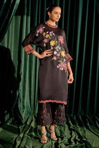 Introducing our elegant black silk organza kimono kurta, beautifully adorned with floral appliqué and intricate beadwork. This stunning piece features flowing sleeves and a graceful silhouette, making it perfect for special occasions. Paired with black Chanderi floral sheer appliqué pants, this ensemble offers a chic and sophisticated look.