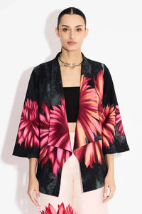 Featuring SHA Black Floral Coverup by Shasha Gaba, this Indo Western shrug is crafted in soft banana crepe offering a graceful drape and modern flair. Ideal for pret wear it adds effortless elegance to any outfit perfect for layering over both traditional and contemporary ensembles.