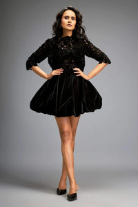 A floral-cut velvet crop top with a voluminous bubble bottom, combining rich texture and playful silhouette for a bold, fashionable statement.