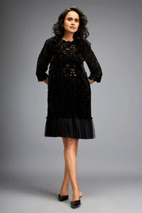 A floral-cut velvet shift dress with a delicate sheer hemline, offering a luxurious blend of texture and elegance for a sophisticated, modern look.