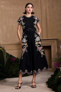 This black Kalacotton midi dress features exquisite floral appliqué, threadwork, beadwork, and cutwork, creating a beautifully textured design. The intricate detailing adds depth and elegance to the sleek black fabric, making it a perfect choice for both formal and festive occasions. The midi length offers a flattering, sophisticated silhouette.