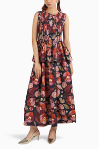 Black floral cotton skirt and top set with a sleeveless gathered top and flowy long skirt. The set features bright, eye-catching floral prints and is super comfy to wear all day. The top has a stylish flare that adds a playful touch, while the skirt gives it a graceful and breezy look. Perfect for brunch, vacations, or casual outings.