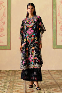 Featuring a black silk organza kaftan adorned with floral threadwork, beadwork, and intricate cutwork, paired with black chanderi pants enhanced with sheer applique and delicate beadwork.