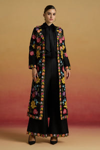 Featuring Black Floral Threadwork Long Jacket by Chandrima’s Amaryllis FW25 Collection. Crafted in black chanderi, this long jacket features multicolour floral threadwork and bead embellishments, creating a statement layer that blends traditional artistry with contemporary sophistication.