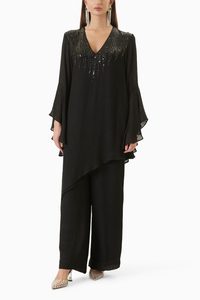 Indulge in elegance with our Black Flow Coord set, featuring black and gold thread stitching, sequins, and intricate pipe work. This set offers a stylish straight loose fit for a touch of luxury in your attire.
