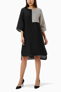 Wander through the serene woods on fine linen, gleaming in gold with abstract brush strokes, textures, and patterns that come to life through meticulous hand screen printing and foiling- elevating your style quotient to a new high this season. A round-neck, asymmetrical dress, with 1/8th detailing.