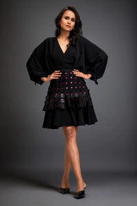 Featuring the Black Fuchsia Flicker Layered Dress by Deepika Arora's Metallic collection, this striking mini dress is crafted from Rozella Crepe and Vegan Leather. With voluminous sleeves, intricate woven detail, and bold pink 3D accents on a layered skirt, it offers a true-to-size fit with dramatic flair.