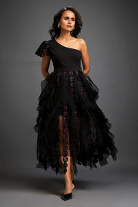 Featuring the Black Geometry Tulle Skirt by Deepika Arora's Metallic collection, this tiered tulle design is elevated with intricate geometric detailing. Crafted from Net and Vegan Leather, it delivers bold texture and dimension while maintaining a true-to-size fit with modern drama.