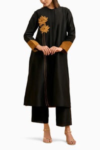 This Black & Gold color-blocked long kurta exudes sophistication with its refined mandarin collar and concealed placket. The elegant embroidery on the front panel enhances its timeless appeal, while the long sleeves add a classic touch. Paired with ankle-length straight-fit pants featuring side-seam piping, this ensemble offers a sleek, modern finish that’s perfect for a chic, stylish look.