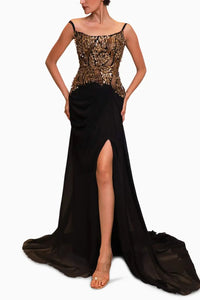 Step into elegance with our designer black-and-brown maxi gown, adorned with exquisite textured leaf work and intricate katdana embellishments. This designer maxi gown is a true blend of sophistication and timeless grace, perfect for any grand celebration or evening event.