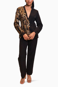 Command attention with power dressing redefined. This black co-ord set features a sharply tailored blazer adorned with intricate gold hand embroidery on one side, creating a striking asymmetrical design. Paired with straight black trousers, this outfit fuses authority and artistry — ideal for evening galas, red carpets, luxury launches, or any event that demands a statement look. The embroidery, a rich medley of sequins, zari, and beadwork, elevates the ensemble into timeless couture elegance.