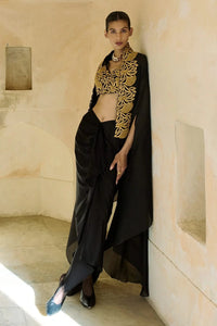 Featuring Black Gold Noira Cape Set by Ritika Arya Jain's RAYA collection, a 3-piece ensemble with an embroidered bralette, flowing organza cape, and signature draped skirt in striking black and gold, exuding opulence and effortless glamour.