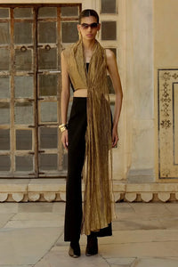 Featuring Black Gold Ray Of Raya Set by Ritika Arya Jain's RAYA collection, a sculpted top with a cascading pleated gold tissue trail, paired with sharp black trousers. A refined interplay of radiance and architectural structure.