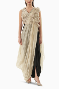 Featuring the Black Golden Antique Blouse with Chanderi Applique Fusion Saree by Renasci from the Untamed Collection. Luxurious Applique Tissue, Satin & Chanderi create a fitted ensemble with a bralette, skirt, and dupatta, blending sophistication in black and golden hues with a unique Drape-Antifit style.