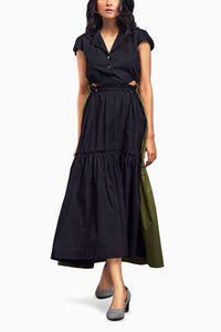 Black & Green Lapel Collar Long Dress With Side Cutouts