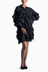 Featuring our stunning Black Metallic Georgette Ruffle Dress, a perfect blend of elegance and glamour. The lustrous metallic finish adds a touch of sophistication, while the cascading ruffles bring a playful and feminine charm.