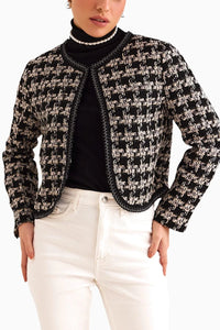 Stylist short tweed jacket, cropped outerwear piece characterized by its structured fit and textured tweed fabric. Typically ending at or above the waist, it features classic design elements such as a round button, hook closures, and clean tailoring. Often embellished with details like elegant trims, contrast it exudes a chic, timeless appeal. Perfect for layering over dresses, blouses, or high-waisted pants, a short tweed jacket is ideal for elevating both casual and formal looks.